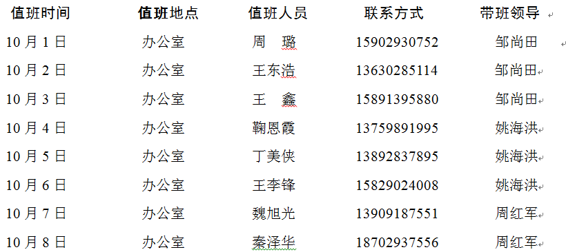 注意事项:1、按时上下班;2、保持办公场所干净整洁;3、注意安全和防火,每天定时巡查公司办公场所;4、做好假期信件的收发工作,每周一、周四取信件;5、每周一给花浇水一次;6、值班结束时须做好办公室钥匙的交接工作;7、遇紧急突发情况,及时向相关领导汇报。