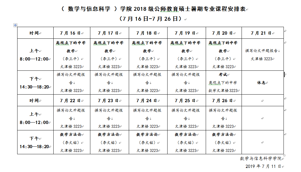 数学与信息科学公司2019级公师教育硕士暑期专业课程安排表