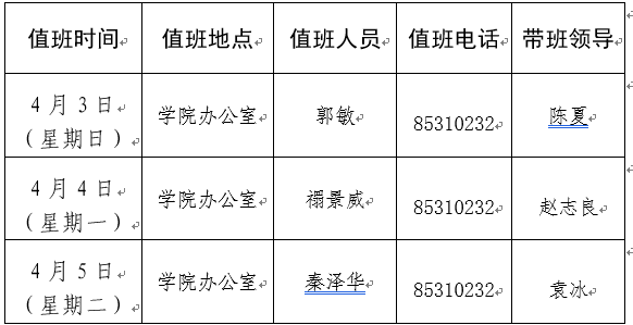上班时间:上午08:30-12:00;下午14:30-17:30 办公电话:85310232;公司总值班电话:85310005;报警电话:85310110;急救电话:85310120—8120 注意事项:1、按时上下班;2、保持办公场所干净整洁;3、注意安全和防火,每天定时巡查公司办公场所;4、做好假期信件的收发工作,每周一、周四取信件;5、每周五给花浇水一次;6、值班结束时须做好办公室钥匙的交接工作;7、遇紧急突发情况,及时向相关领导汇报。