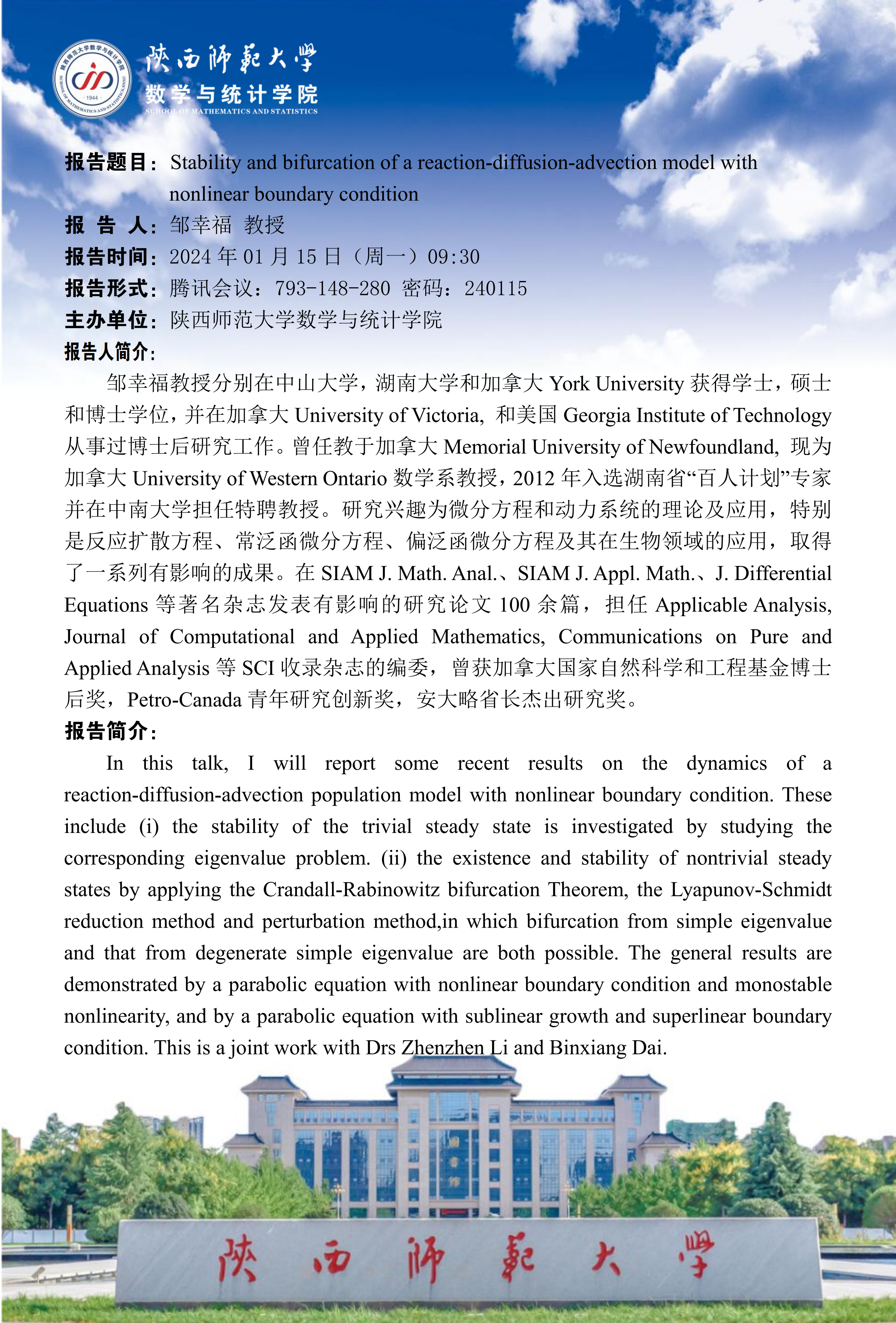 八秩同辉校庆系列4 Stability and bifurcation of a reacion-diffusion-advection model with nonlinear boundary condition