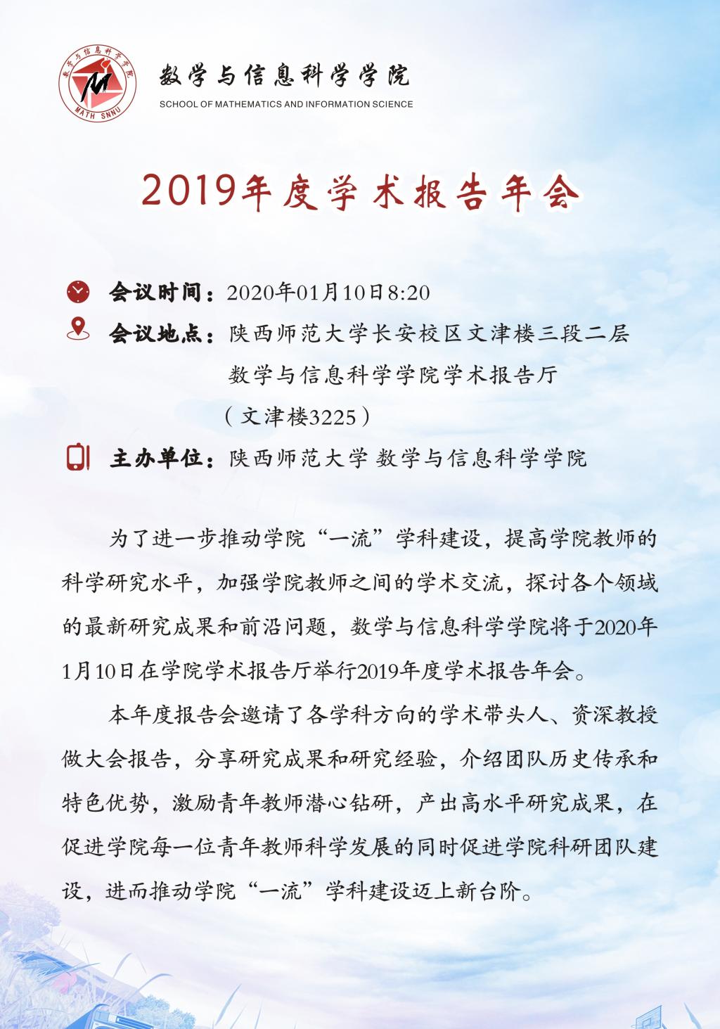 为了进一步推动公司“一流”团队建设,提高公司教师的科学研究水平,加强公司教师之间的学术交流,探讨各个领域的最新研究成果和前沿问题,数学与信息科学公司将于2020年1月10日在公司学术报告厅举行2019年度学术报告年会。