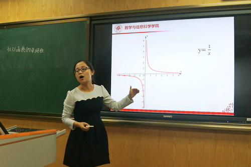 同学们在短暂的7分钟讲课时间内,利用多媒体辅助教学,充分展示自我教学风采,演绎了一场场精彩的小课堂。课堂安排全面,包括了课前回顾、问题探究、知识讲解、例题展示、课堂小结、习题布置等部分。同学们精心描绘的生动形象的图形,设计的整齐美观的板书,条理清晰逻辑严明的课程,展现的自然大方的“台风”,得到了评委老师和台下观众的连连好评。