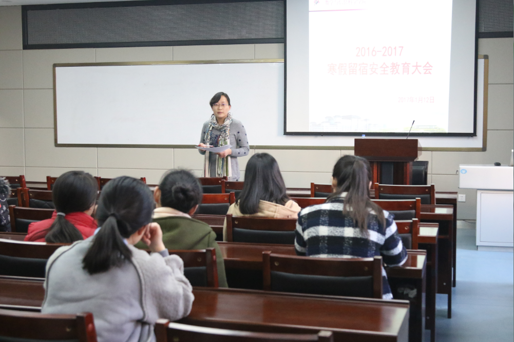 为做好寒假期间留校生的教育管理工作,2017年1月12日下午,公司在学术报告厅召开了2016-2017学年寒假留宿安全教育大会。党委副书记邹尚田、团委书记王鑫、2014级辅导员王东浩、2015级辅导员何苗及全体留宿生本科生、研究生参加了大会。