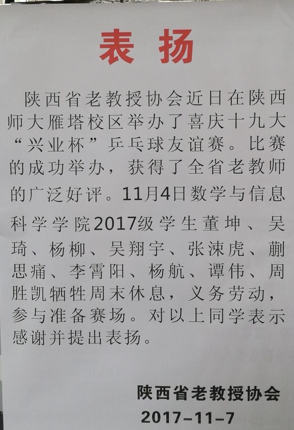 11月4日,陕西省老教授协会在十大正规买足球网站雁塔校区举办了喜迎十九大“兴业杯”乒乓球友谊赛。公司2017级员工董坤、吴琦、杨柳、吴翔宇、张涑虎、蒯思痛、李霄阳、杨航、谭伟、周胜凯牺牲周末休息时间,义务劳动,参与场地的准备工作,为比赛的成功举办贡献了力量。为感谢同学们的劳动,陕西省老教授协会特在11月7日向公司寄来表扬信。